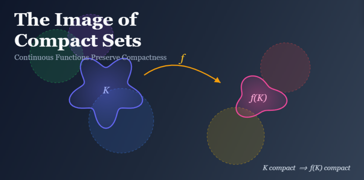 This is remarkable! Continuity is a local property—it’s about what happens in neighborhoods around points. Compactness is a global property—it’s about covers of entire sets. Yet continuous functions bridge these worlds: they take compact sets to compact sets.